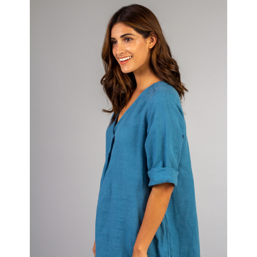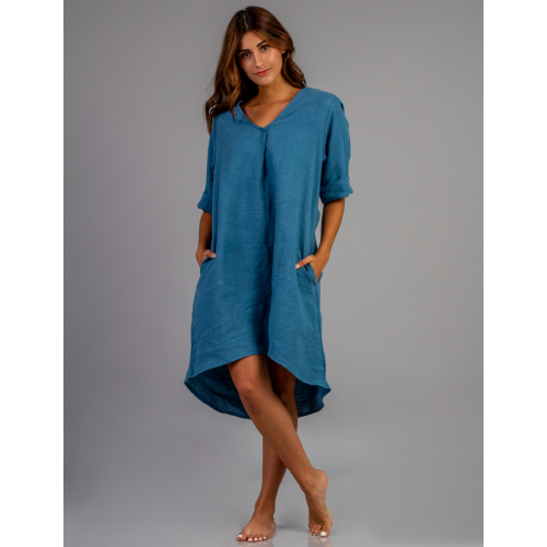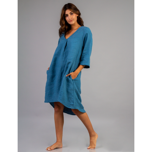 Vestido corto y mnagas 3/4 con escote en V/ 100% lino