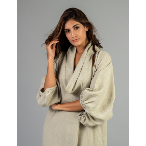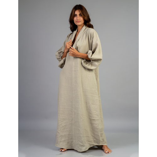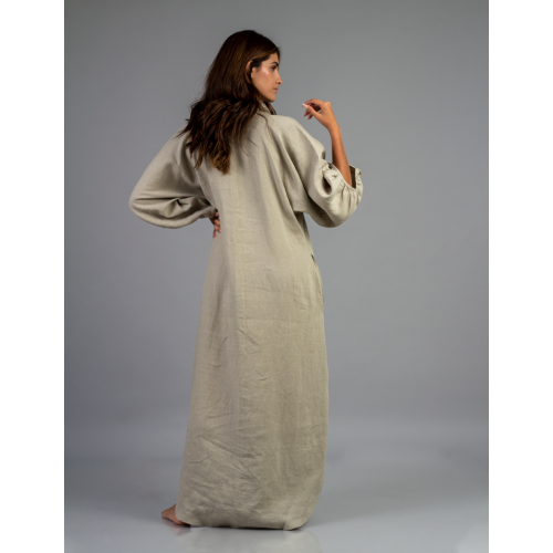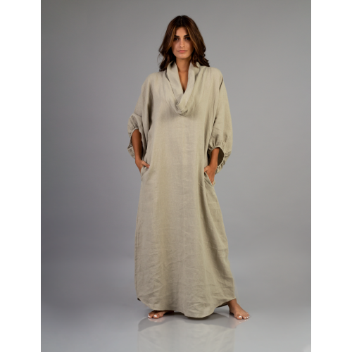 Vestido largo tipo kaftan con cuello caído y bolsas. 100% lino